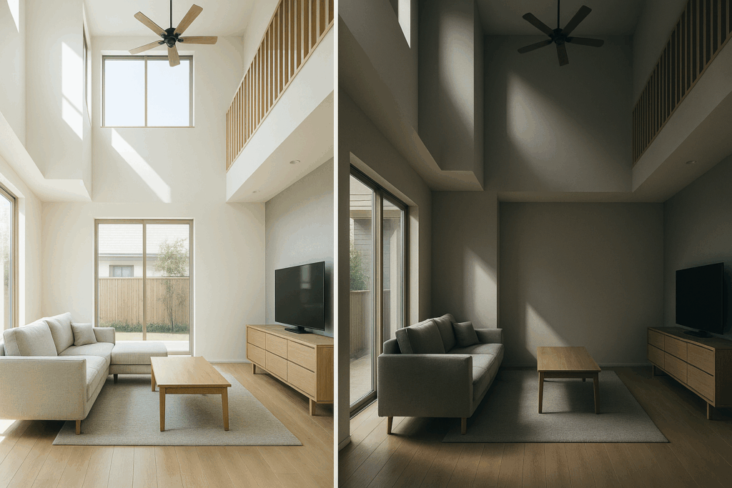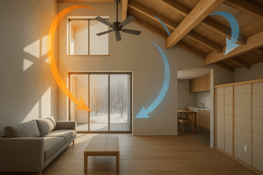 吹き抜けの寒さや冷房効率は、設計条件によって差が出ます。高さ、窓の向き、窓面積、断熱性能、シーリングファンの有無などが代表的な要因です。特に南面の大きな窓は冬の採光に役立ちますが、夏は日射遮蔽が必要になります。