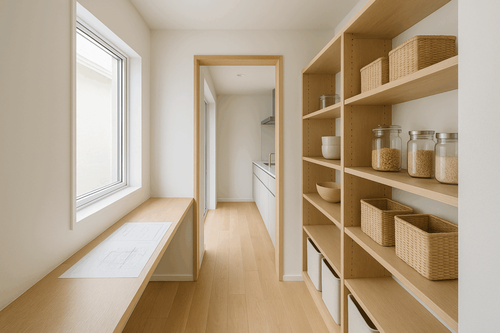 吹き抜けの近くにパントリーやリビング収納をまとめると、明るさと使いやすさが両立します。暗くなりがちな収納に光が入るため、在庫の確認や片付けが楽になります。