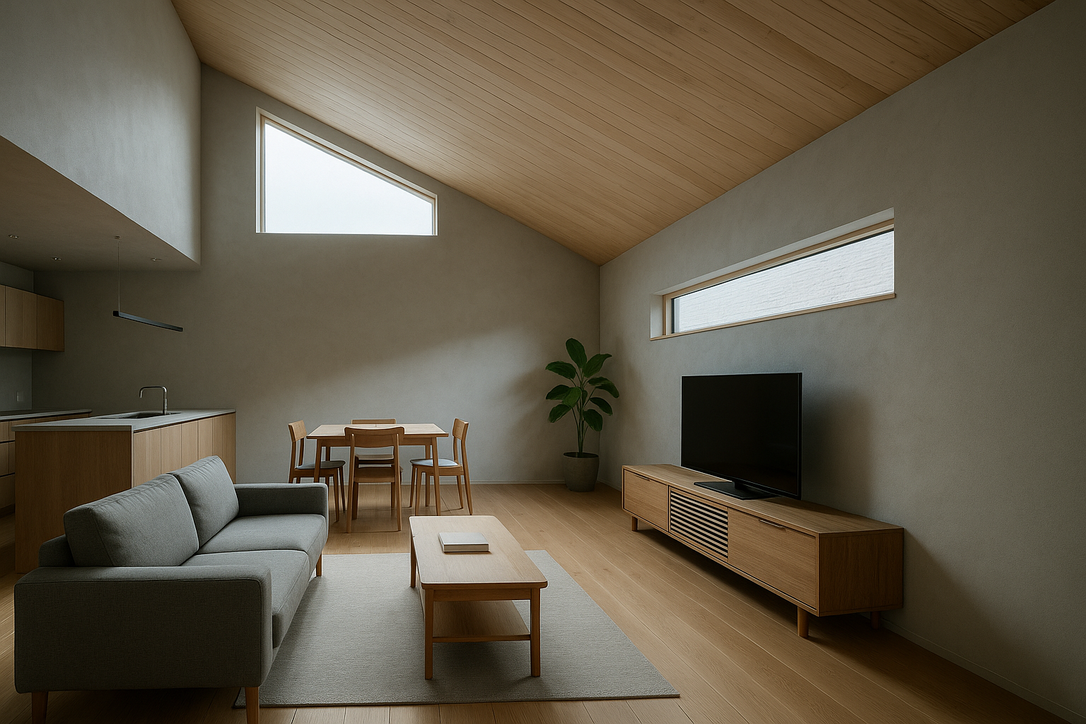 勾配天井を採用すると、高さのグラデーションによって「ひらく場所」と「こもる場所」が自然に分かれます。家族が集まるエリアには開放感が生まれ、静かに過ごしたいスペースには落ち着きが宿ります。さらに、高窓やトップライトと組み合わせると、光と風の動きもコントロールしやすくなります。視線・光・風・音をまとめて整える要素として勾配天井を位置づけると、長く住むほど価値を実感できる空間になります。