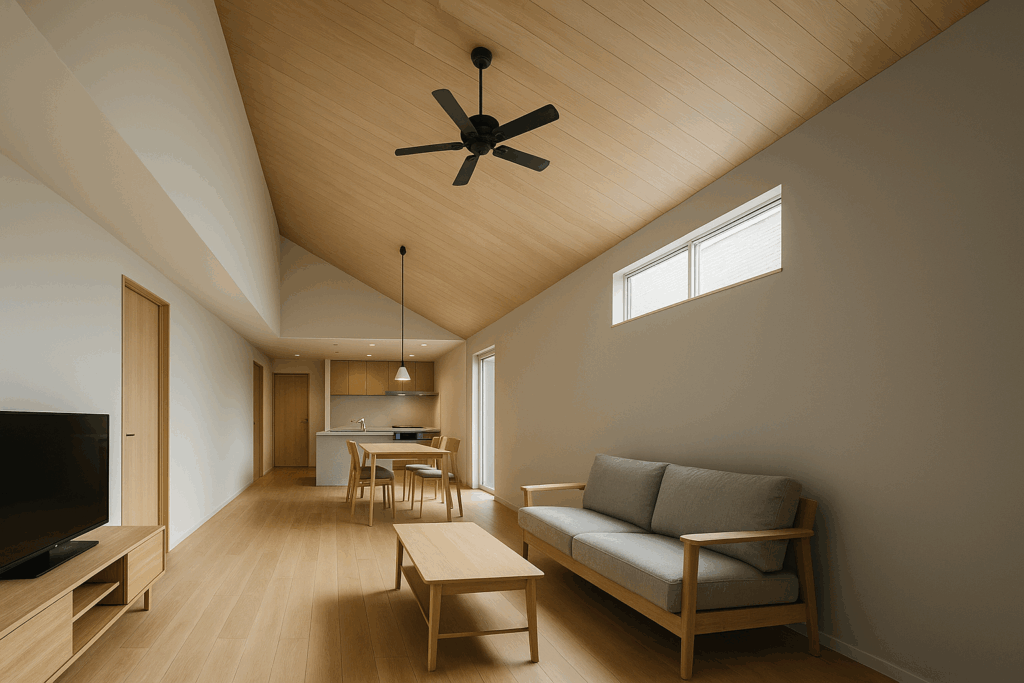 夏は高い位置の窓から強い日射が入りやすいため、遮熱性能の高いガラスや庇で調整します。冬は勾配天井の高い側から差し込む日差しを取り込む構成にすると、暖房効率が安定します。上下の温度差はシーリングファンで緩和し、光と熱を勾配天井と一緒に整える意識が役に立ちます。