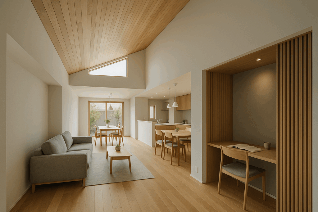 勾配天井の良さは、暮らし方と結びついたときによりはっきりします。静かな時間を味わいたい人、家族の団らんを重視する人、在宅勤務が多い人など、暮らしの軸ごとに合う勾配の使い方があります。