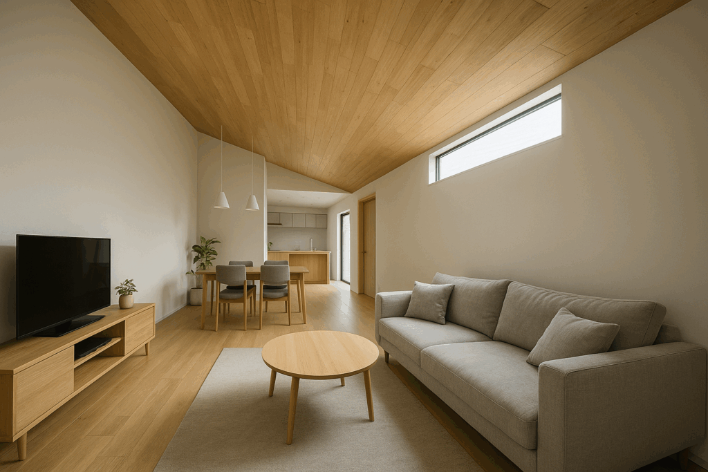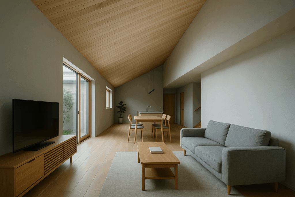勾配天井は見た目の演出だけでなく、視線の流れや居心地、光と風の入り方まで立体的に調整できる仕組みです。高さの変化が心理にも作用し、同じ床面積でも広さの実感が変わります。