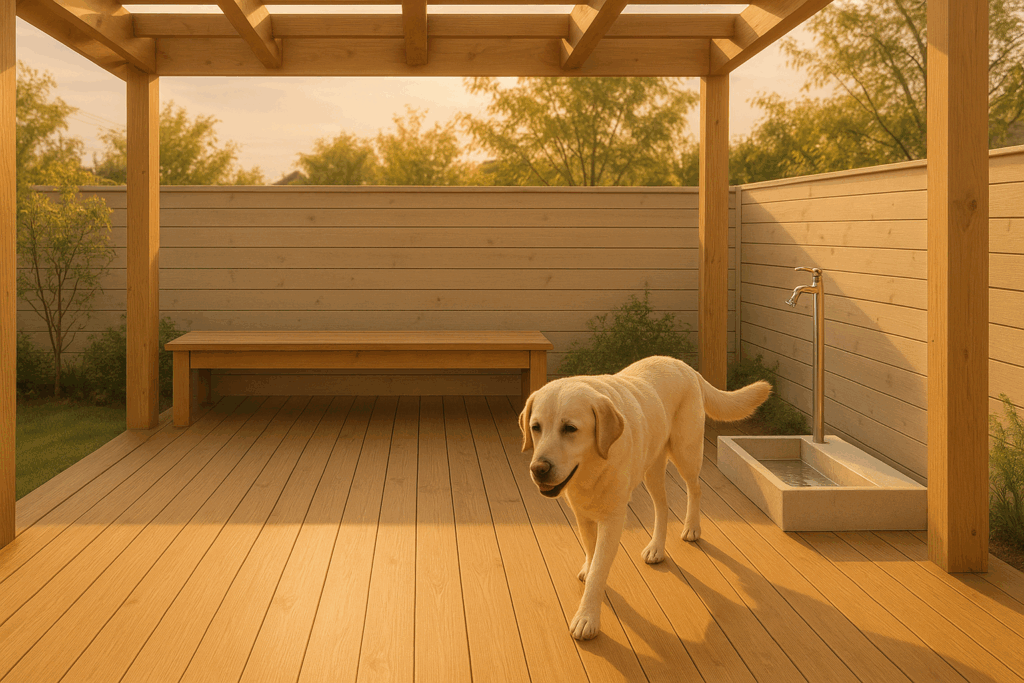 パーゴラがあると直射日光を避けやすくなります。低めのベンチは犬が寄りやすい高さです。水飲み場の横に休憩配置があると外時間が安定します。レイアウトの工夫が快適なデッキ空間につながります。